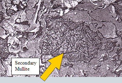 There are two types of mullite formed. The mullites can be distinguished by their size. One of them is the primary mullite (< 0.5µm) which appears to be scaly as compared to the other more well known needle type mullite. The primary mullite originates from kaolin or clay in the batch by a solid state reaction. It forms at a lower temperature and is the product of the clay minerals. The needle type mullite (> 1µm) can be referred to as the secondary mullite and are formed with the assistance of the melt by dissolution and re-crystallisation of alumino-silicates when feldspar is added to the batch. The main differences between the primary and secondary types of mullite are the size, shape and degree of aggregation of the mullite crystals [4,5,6]. Figure 1 and 2 illustrates by SEM the two types of mullite.