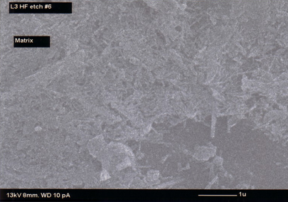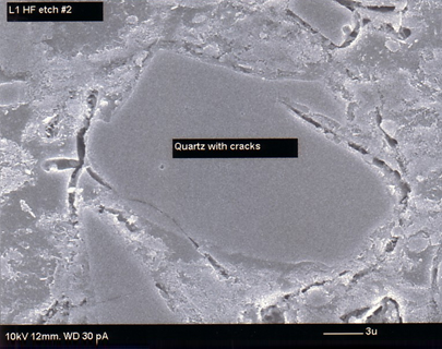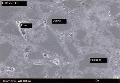 The other theory to explain mechanical strength is the matrix reinforcement hypothesis [9]. There is a fair amount of residual quartz particles as only a small portion dissolves in the melt. These residual quartz particles can be observed in Figure 3 and more clearly in Figure 5. These unreacted quartz crystals have a higher coefficient of thermal expansion than the surrounding matrix (glassy phase). The strong compressive stresses on the glassy phase cause strength improvements of the porcelain body.