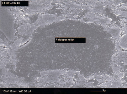 The SEM micrograph (Figure 3) shows the different phases of a porcelain tile body. During firing the main crystalline phases corresponding to the mineral such as feldspar in the unfired body disappear. New crystalline and amorphous phases are developed. The phase composition of the porcelain tile body consist of the newly developed phases namely interlocked crystals of mullite and amorphous phase and residual phases present in the original unfired body namely quartz and feldspar. Only a small amount of quartz dissolves in the melt during firing while the rest remains unreacted. Figure 4 shows the feldspar relict while Figure 5 shows the unreacted quartz in L1. Relict is a geological term indicating that the particular grain was that mineral in the unfired body, although it has been altered by firing. A small number of pores are also present in the porcelain tile body [7,8].