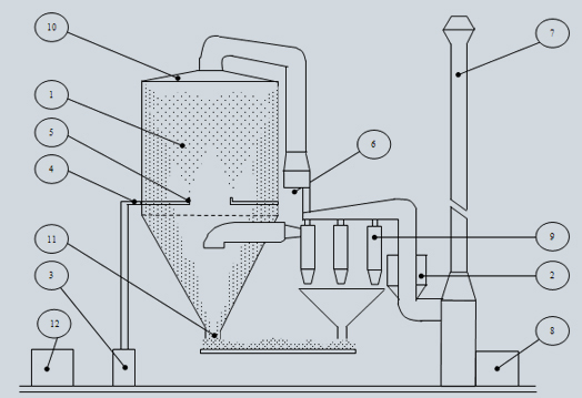 Figure 3 shows the schematic construction of a spray drier. A volumetric pump sends the slip to a set of lances placed inside the dryer. At the lances' extremities, the slip is atomized into fine particles by nozzles and then is sprayed toward the top of the drying chamber against concurrent descending hot air that rapidly evaporates water from the slip. The spray-dried powder produced falls to the bottom of the dryer where it is unloaded by means of an extractor valve. Exhaust air goes through a set of cyclones to recycle the small quantity of fine powder it contains, then to a wet scrubber system for further cleansing before it is expelled as steam [4,6]. The two most important properties to be controlled are the moisture content and the size distribution of the granulate [4].